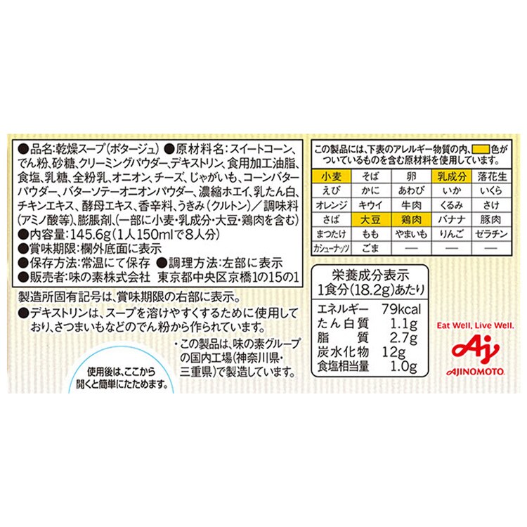 | スイートコーン、でん粉、砂糖、クリーミングパウダー、デキストリン、食用加工油脂、食塩、乳糖、全粉乳、オニオン、チーズ、じゃがいも、コーンバターパウダー、バターソテーオニオンパウダー、濃縮ホエイ、乳たん白、チキンエキス、酵母エキス、香辛料、うきみ(クルトン)/調味料(アミノ酸等)、膨脹剤、(一部に小麦・乳成分・大豆・鶏肉を含む) |