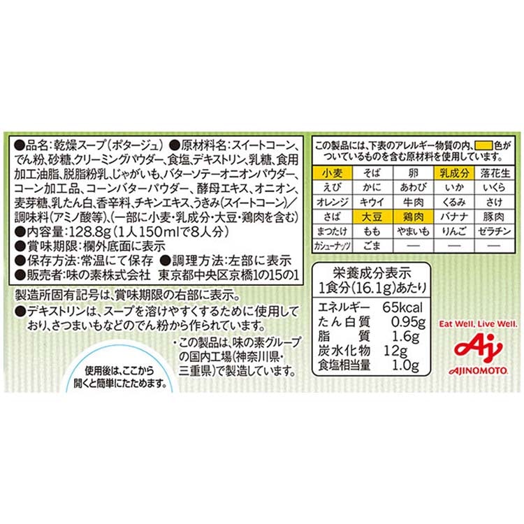 | スイートコーン、でん粉、砂糖、クリーミングパウダー、食塩、デキストリン、乳糖、食用加工油脂、脱脂粉乳、じゃがいも、バターソテーオニオンパウダー、コーン加工品、コーンバターパウダー、酵母エキス、オニオン、麦芽糖、乳たん白、香辛料、チキンエキス、うきみ(スイートコーン)/調味料(アミノ酸等)、(一部に小麦・乳成分・大豆・鶏肉を含む) |