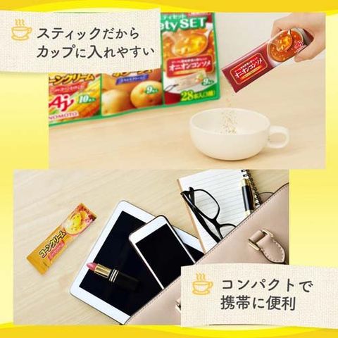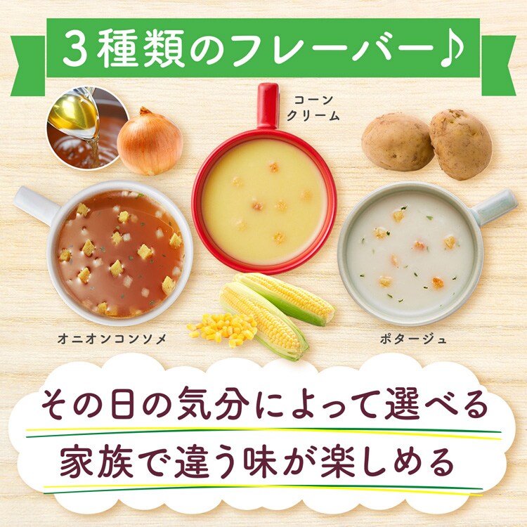 ●コーンクリーム、ポタージュ、オニオンコンソメの3つのメニューを詰め合わせた、アソートタイプのインスタントスープです。