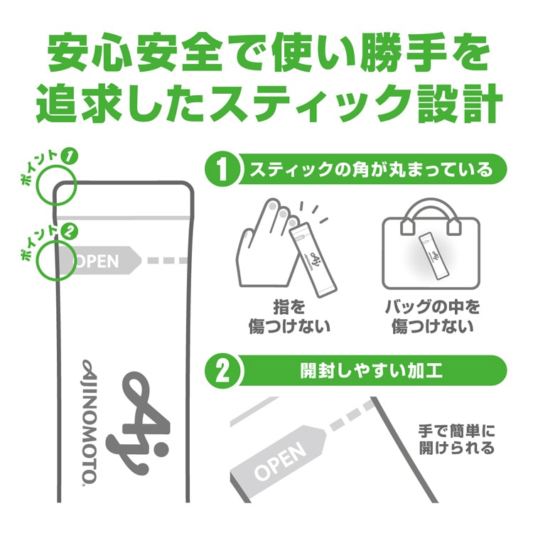 ●個包装のスティックタイプなので、カップに入れやすく、場所を取らずに収納でき、持ち運びにも便利です。