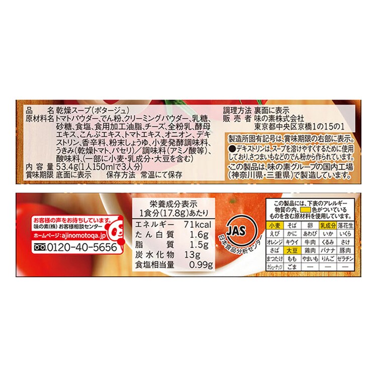 | トマトパウダー、でん粉、クリーミングパウダー、乳糖、砂糖、食塩、食用加工油脂、チーズ、全粉乳、酵母エキス、こんぶエキス、トマトエキス、オニオン、デキストリン、香辛料、粉末しょうゆ、小麦発酵調味料、うきみ(乾燥トマト、パセリ)/調味料(アミノ酸等)、酸味料、(一部に小麦・乳成分・大豆・を含む) |