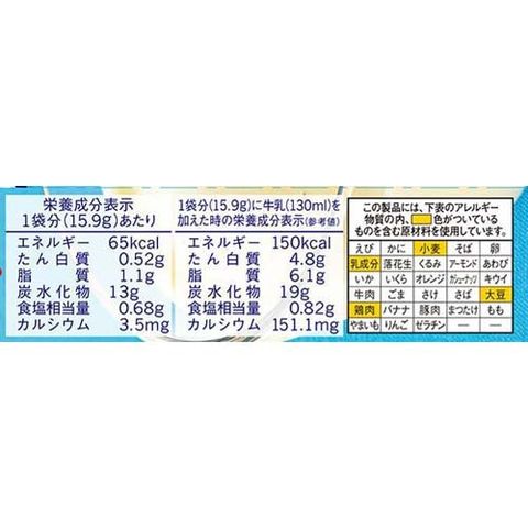 | 1袋分(15.9g)あたり エネルギー:65kcal、タンパク質:0.52g、脂質:1.1g、炭水化物:13g、食塩相当量:0.68g |