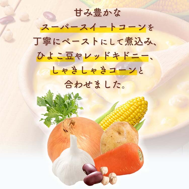 | スイートコーンペースト(国内製造)、ひよこ豆、スイートコーン、乳等を主要原料とする食品、赤いんげん豆、麦芽糖、チキンブイヨン、豆乳、砂糖、食塩、乾燥マッシュポテト、オニオンパウダー、たん白加水分解物、ミルポワペースト、デキストリン、バターソテーオニオンパウダー、にんにくペースト、香辛料、酵母エキス発酵調味料/糊料(加工デンプン)、調味料(アミノ酸等)、香料、(一部に乳成分・大豆・鶏肉を含む) |