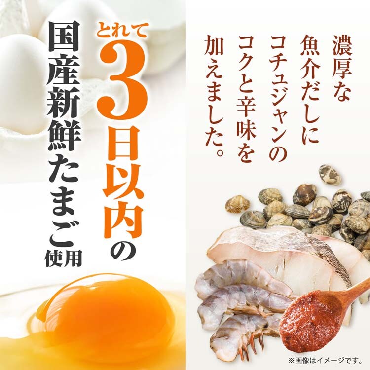 | 卵(国産)、キムチソース、コチュジャン、ビーフエキス、しょうゆ、砂糖、りんご酢、香辛料、食塩、あさりエキス、えび調味料、食用植物油脂、たらパウダー、酵母エキス、酵母エキス調味料、豆板醤、はくさいエキス、たん白加水分解物、粉末みそ、魚醤(魚介類)、うきみ(ほうれんそう、キャベツ)/調味料(アミノ酸等)、糊料(加工でん粉、キサンタンガム)、トウガラシ色素、酸味料、香辛料抽出物、酸化防止剤(ビタミンE)、カロテン色素、(一部に小麦・卵・乳成分・えび・いか・牛肉・大豆・りんご・魚醤(魚介類)を含む) |