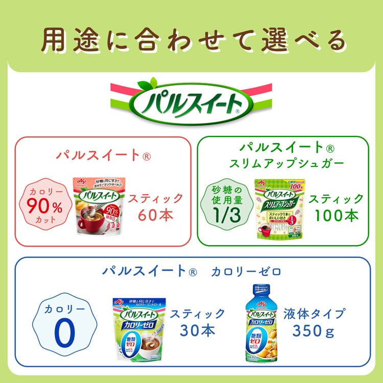 ●「パルスイート スリムアップシュガー」は、砂糖の使用量1/3で同じ甘さのスティックシュガーです。