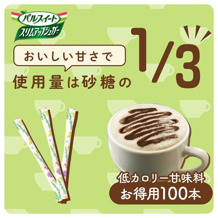 ●「パルスイート スリムアップシュガー」は、砂糖の使用量1/3で同じ甘さのスティックシュガーです。