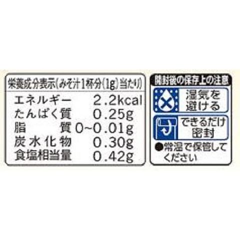 | みそ汁1杯分(1g)当たり エネルギー:2.2kcal、たんぱく質:0.25g、脂質:0~0.01g、炭水化物:0.30g、食塩相当量:0.42g |