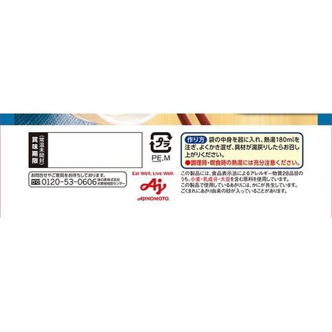 | 粉末味噌(国内製造)、乾燥ほうれん草、乾燥調味あさり、デキストリン、乾燥油揚げ、かつお節粉末、乳糖、かつおエキス、砂糖、酵母エキス、小麦・大豆発酵調味料、でん粉/調味料(アミノ酸等)、酸化防止剤(V.E)、環状オリゴ糖、豆腐用凝固剤、香料、(一部に小麦・乳成分・大豆を含む) |