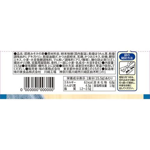 | 粉末味噌(国内製造)、乾燥ほうれん草、乾燥調味あさり、デキストリン、乾燥油揚げ、かつお節粉末、乳糖、かつおエキス、砂糖、酵母エキス、小麦・大豆発酵調味料、でん粉/調味料(アミノ酸等)、酸化防止剤(V.E)、環状オリゴ糖、豆腐用凝固剤、香料、(一部に小麦・乳成分・大豆を含む) |