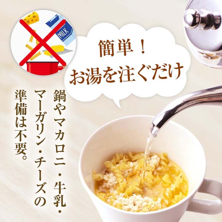 ●5種のチーズ入り濃厚とろとろチーズソースがもちもちパスタ(マカロニ)にたっぷりとからまった、チーズ好きにはたまらないマッケンチーズが、お湯を注ぐだけで簡単に楽しめます。