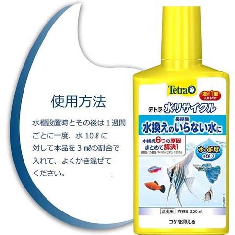 ・水槽設置時とその後は一週間ごとに一度、水10Lに対して本品を3mlの割合で入れ、良くかき混ぜてください。