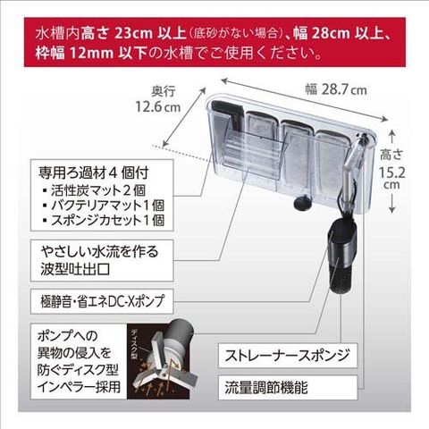 ●水槽内高さ23cm(底砂がない場合)、水槽内幅28cm以上、枠幅12mm以下の水槽でご使用ください。