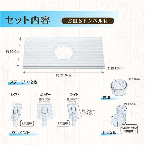 | ステージ×2枚、ジョイント(レフト)、ジョイント(センター)、ジョイント(ライト)、お皿、トンネル |
