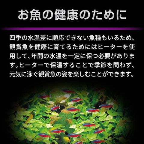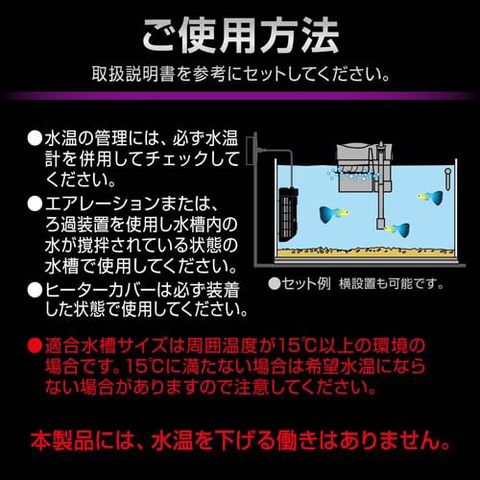 ・適用水槽サイズは周囲温度が15度以上の環境の場合です。15度に満たない場合は希望水温にならない場合があります・本製品には、水温を下げる働きはありません。