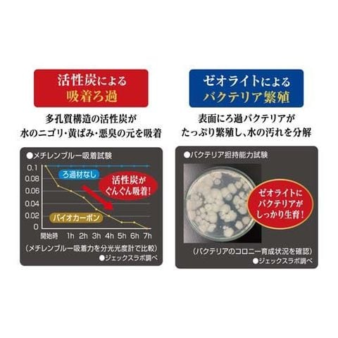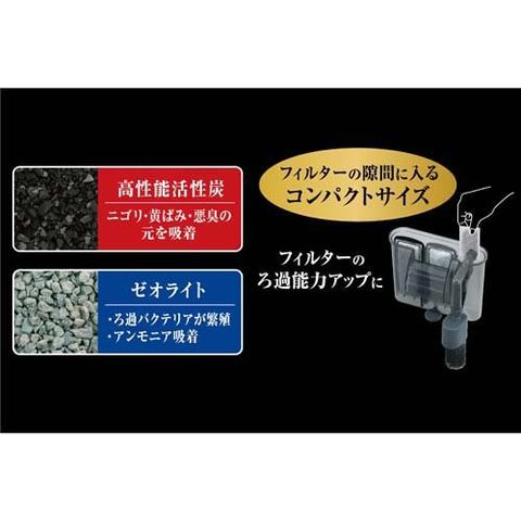 ●ニゴリ・黄ばみ・悪臭の元を取り除く高性能活性炭と、バクテリアが定着し生物ろ過を促進するゼオライトをミックスしたハイブリッドろ過材です。