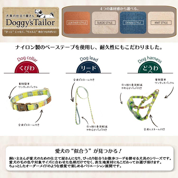 ●同じデザインの首輪、ハーネスがあり、お散歩コーディネートが楽しめる。