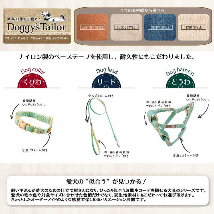 ●同じデザインのリード、ハーネスがあり、お散歩コーディネートが楽しめる。