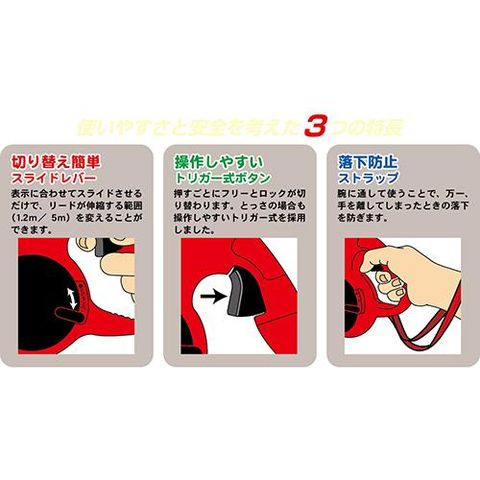 ●本体側面のレバーで長さの切り替え可能なリール式伸縮リード!