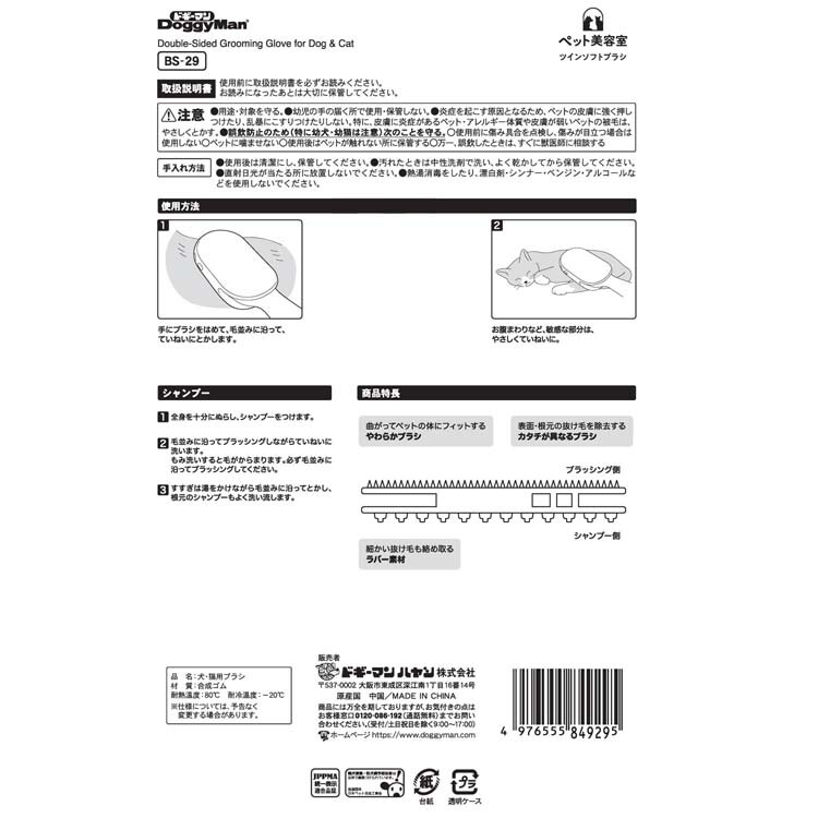 ●細目と粗目、表裏でブラシ面の形状が異なり粗目でシャンプー、細目でブラッシングに使い分けられる。