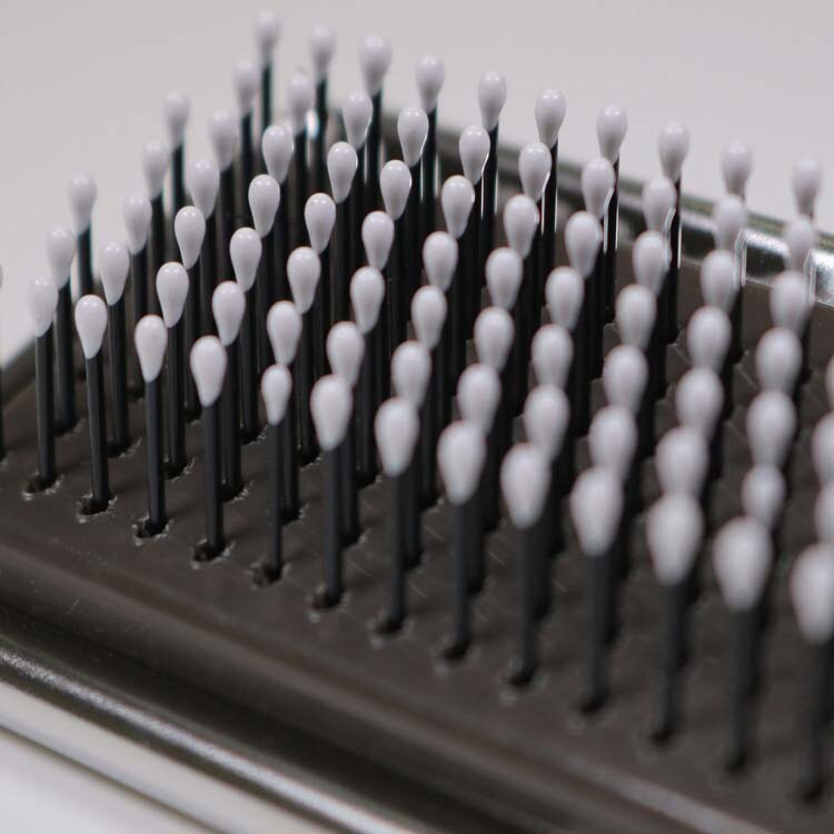 ●樹脂製の細ピンと先丸加工ピンが被毛をときほぐし、抜け毛を取り除く。