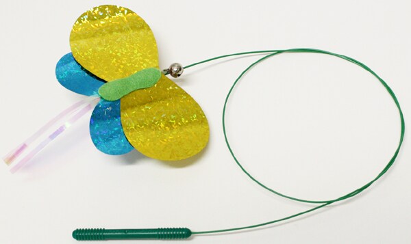 ●猫ちゃんの興味を引く、フィルム素材のひらひらの音や反射、揺れを最大限にいかせる長いワイヤーのおもちゃ