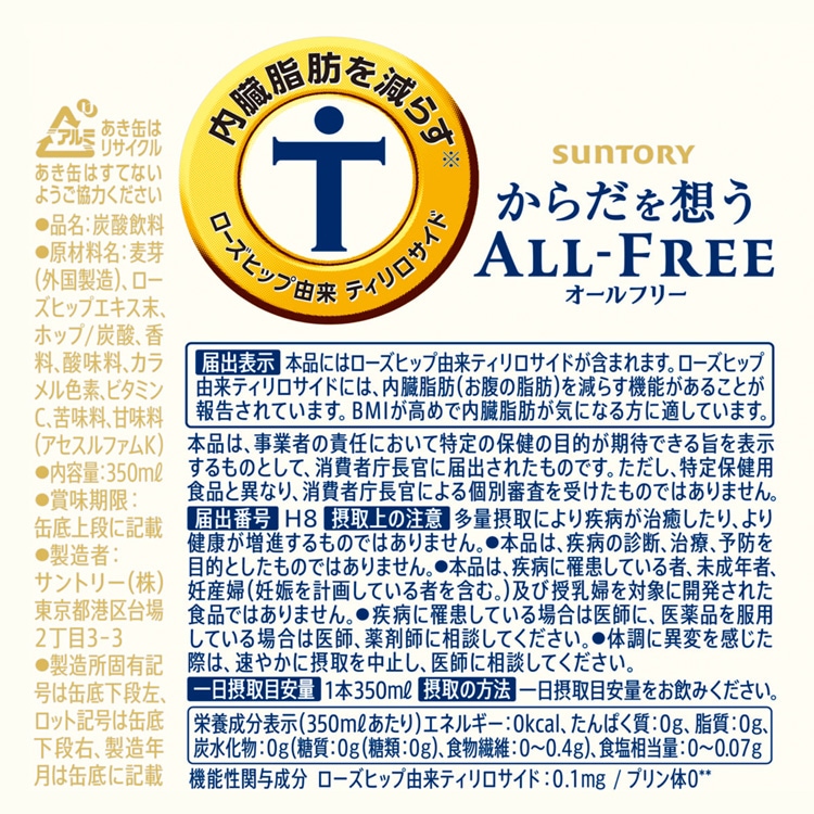 ●ローズヒップ由来「ティリロサイド」の働きで内臓脂肪を減らす「からだ想うオールフリー(機能性表示食品)」から、増量パックが登場!350ml缶*24本に、4本増量してお届けします。