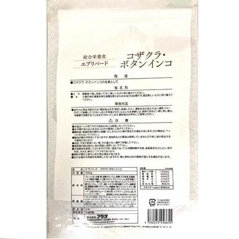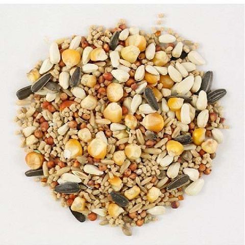 | ペレット(米、米糠、粟、炭酸カルシウム、果糖、天日原塩、乳酸菌、トルラ酵母、糖蜜、ケイ酸アルミナ、アルファミール、麦芽発酵エキス、ビタミン類(A、D3、E、B1、B2、B6、B12、D-パントテン酸カルシウム、ニコチン酸)、ミネラル類(硫酸マンガン、硫酸亜鉛、硫酸銅、硫酸マグネシウム、硫酸鉄、塩化コバルト)、アミノ酸類(塩化コリン、メナジオンK3)、香料)、キビ、マイロ、カナリアシード、小粒ひまわり、メーズ、麻の実、サフラワー、ムキえん麦、ボレー、グリーンボレー |
