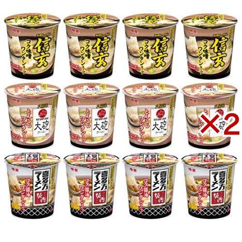 | ★大砲ラーメン監修 とんこつ味:液体スープ(ポークエキス(国内製造)、豚脂、香味調味料、油脂加工品、しょうゆ、砂糖混合異性化液糖・水飴、食塩、たん白加水分解物、香辛料(ガーリック))、かやく入り粉末スープ(豚・鶏エキス、砂糖、食塩、ポーク調味料、乳等を主要原料とする食品、ごま、乾燥ねぎ、香辛料(ガーリック、ペッパー、赤唐辛子)、酵母エキス、たん白加水分解物、粉末油脂、植物油脂、香味調味料)、ワンタン(小麦粉、味付鶏肉、植物性たん白、食塩、乳化油脂、酵母エキス)/加工デンプン、調味料(アミノ酸等)、増粘多糖類、香料、酒精、ソルビット、微粒二酸化ケイ素、カラメル色素、かんすい、(一部に卵・乳成分・小麦・えび・いか・ごま・大豆・鶏肉・豚肉・ゼラチンを含む) ★札幌らーめん信玄監修 コク味噌味:液体スープ(みそ(国内製造)、ポークエキス、豚脂、砂糖、ローストオニオンペースト、香味油、食塩、みそ加工品、ポーク調味料、香辛料(ガーリック、ジンジャー)、たん白加水分解物)、かやく入り粉末スープ(みそ粉末、砂糖、ポークエキス、食塩、香味調味料、乾燥ねぎ、粉末油脂、香辛料(ガーリック、ジンジャー)、酵母エキス、植物油脂)、ワンタン(小麦粉、味付鶏肉、植物性たん白、食塩、乳化油脂、酵母エキス)/加工デンプン、調味料(アミノ酸等)、香料、増粘多糖類、酒精、カラメル色素、リン酸塩(Na)、微粒二酸化ケイ素、ソルビット、乳化剤、かんすい、香辛料抽出物、(一部に卵・乳成分・小麦・えび・ごま・大豆・鶏肉・豚肉・ゼラチンを含む) ★喜多方ラーメン坂内監修コク醤油味:粉末スープ(ポーク調味料、チキン調味料、しょうゆ、食塩、砂糖、たん白加水分解物、香辛料(ガーリック、ペッパー)、香味調味料、豚・鶏エキス、植物油脂、昆布粉末)、ワンタン(小麦粉(国内製造)、味付鶏肉、植物性たん白、食塩、乳化油脂、酵母エキス)、かやく(味付豚肉、乾燥ねぎ)、液体スープ(豚脂、しょうゆ、ポークエキス、食塩、たん白加水分解物、砂糖、醸造酢、香味油)/加工デンプン、調味料(アミノ酸等)、微粒二酸化ケイ素、酒精、ソルビット、カラメル色素、香料、かんすい、酸味料、くん液、(一部に卵・乳成分・小麦・えび・ごま・大豆・鶏肉・豚肉・ゼラチンを含む) |