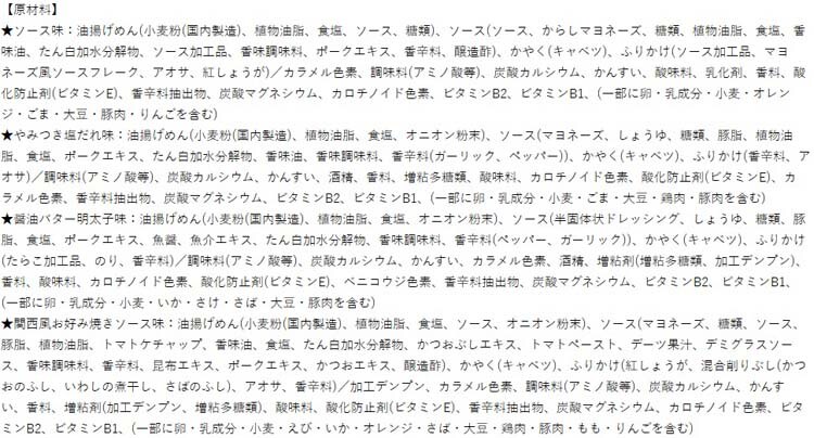 | ★ソース味:小麦、卵、乳成分、豚肉、大豆、ごま、りんご、オレンジ ★やみつき塩だれ味:小麦、卵、乳成分、豚肉、鶏肉、大豆、ごま ★醤油バター明太子味:小麦、卵、乳成分、豚肉、いか、さけ、さば、大豆 ★関西風お好み焼ソース味:小麦、卵、乳成分、えび、豚肉、鶏肉、いか、さば、大豆、りんご、オレンジ、もも |