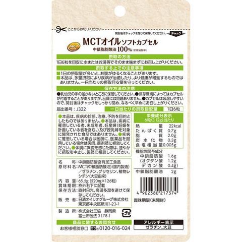 | 6粒当たり エネルギー:22kcal、たんぱく質:0.7g、脂質:2.0g、炭水化物:0.3g、食塩相当量:0.005g 機能性関与成分 中鎖脂肪酸:1.6g(オクタン酸:1.2g、デカン酸:0.4g) |