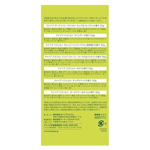 クナイプ グーテナハト バスソルト ホップ&バレリアンの香り、クナイプ バスソルト ラベンダーの香り、クナイプ バスソルト オレンジ・リンデンバウム<菩提樹>の香り、クナイプ バスソルト ハッピーフォーミー ロータス&ジャスミンの香り、クナイプ バスソルト ネロリの香り、クナイプ バスソルト サンダルウッドの香り、クナイプ バスソルト ローズマリー&タイムの香り