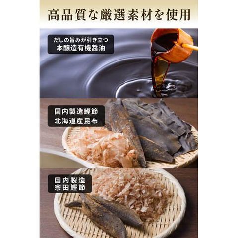 | 有機しょうゆ(国内製造)、砂糖、かつおぶし、食塩、みりん、そうだがつおぶし、醸造酢、こんぶ、酵母エキス、(一部に小麦・大豆を含む) |