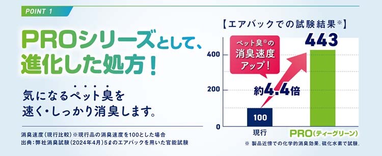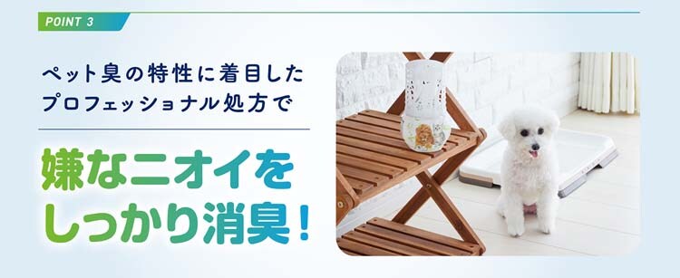 ●ペットの糞尿臭・体臭に効果的な消臭成分配合で、ペット特有のニオイを消臭します。(効果は使用環境により異なります)