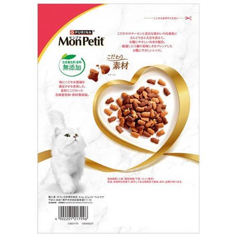 | 穀類(小麦、コーングルテン、米等)、肉類(家禽ミール等)、動物性油脂、たんぱく加水分解物、豆類(脱脂大豆、えんどう豆)、フィッシュパウダー(サーモン、白身魚)、ミネラル類(カルシウム、リン、カリウム、ナトリウム、クロライド、マグネシウム、鉄、銅、マンガン、亜鉛、ヨウ素、セレン)、ビタミン類(A、D、E、B1、B2、パントテン酸、ナイアシン、B6、葉酸、ビオチン、B12、コリン)、カラメル色素、アミノ酸類(タウリン) |