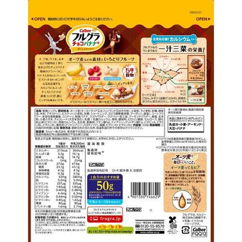 ●バナナなどのドライフルーツ、食物繊維・鉄分・8種のビタミンたっぷり&カルシウムも入った、楽しい朝を応援するフルグラチョコバナナ味です。