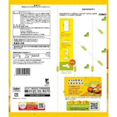 | じゃがいも(国産又はアメリカ)、植物油、砂糖、食塩、バターパウダー、果糖、でん粉、たん白加水分解物(大豆を含む)、はちみつパウダー、マスカルポーネチーズパウダー、クリーミングパウダー、パセリ、酵母エキスパウダー、レモンパウダー/調味料(アミノ酸)、香料、甘味料(アスパルテーム・L-フェニルアラニン化合物、スクラロース、ステビア) |