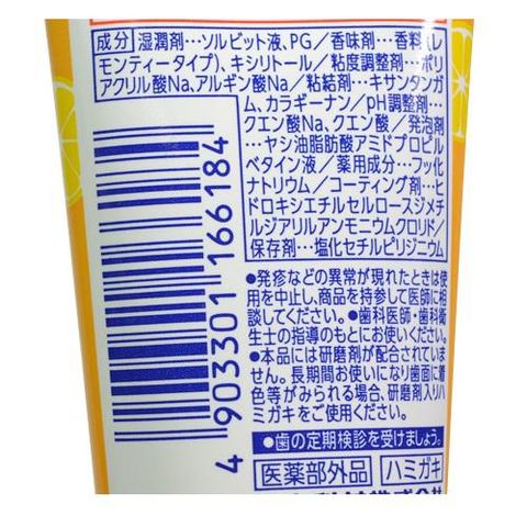 | 湿潤剤(ソルビット液、PG)、香味剤(香料(レモンティータイプ)、キシリトール)、粘度調整剤(ポリアクリル酸ナトリウム、アルギン酸ナトリウム)、粘結剤(キサンタンガム、カラギーナン)、pH調整剤(クエン酸ナトリウム、クエン酸)、発泡剤(ヤシ油脂肪酸アミドプロピルベタイン液)、薬用成分(フッ化ナトリウム)、コーティング剤(ヒドロキシエチルセルロースジメチルジアリルアンモニウムクロリド)、保存料(塩化セチルピリジニウム) |