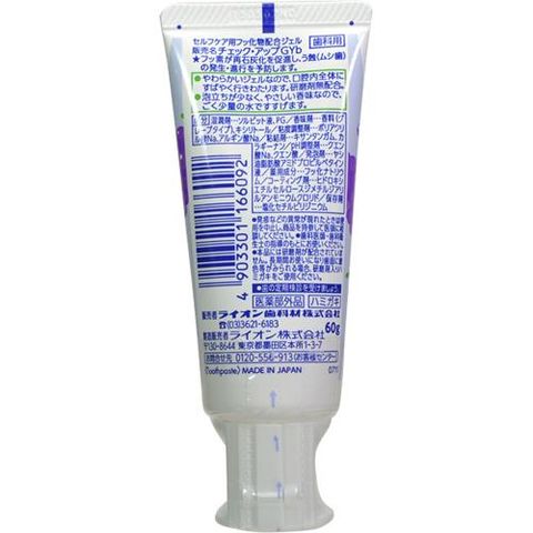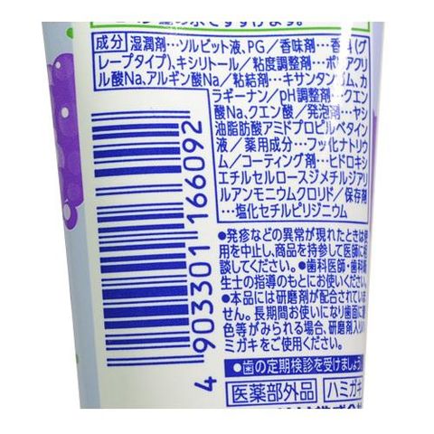 | 湿潤剤(ソルビット液、PG)、香味剤(香料(グレープタイプ)、キシリトール)、粘度調整剤(ポリアクリル酸ナトリウム、アルギン酸ナトリウム)、粘結剤(キサンタンガム、カラギーナン)、pH調整剤(クエン酸ナトリウム、クエン酸)、発泡剤(ヤシ油脂肪酸アミドプロピルベタイン液)、薬用成分(フッ化ナトリウム)、コーティング剤(ヒドロキシエチルセルロースジメチルジアリルアンモニウムクロリド)、保存料(塩化セチルピリジニウム) |