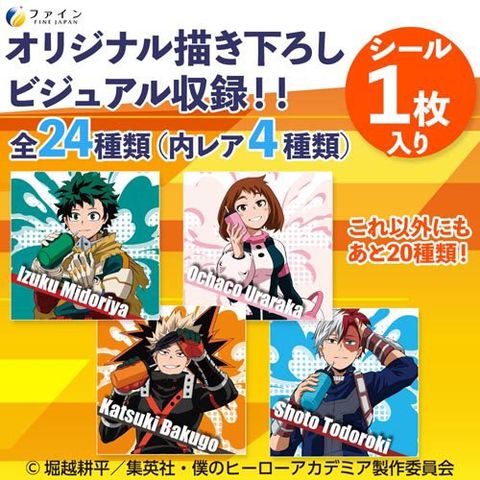 緑谷出久や、爆豪勝己、麗日お茶子、轟焦凍のキャラクターがデザインされた限定のオリジナルシール全24種が1箱につき1枚ランダムで付いてきます。※シールは選べません