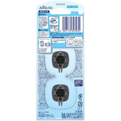 2.セット方法:香りを確認して、クリップをエアコン送風口に取り付ける。エアコンのルーバーが厚い場合、無理にはめ込まない。