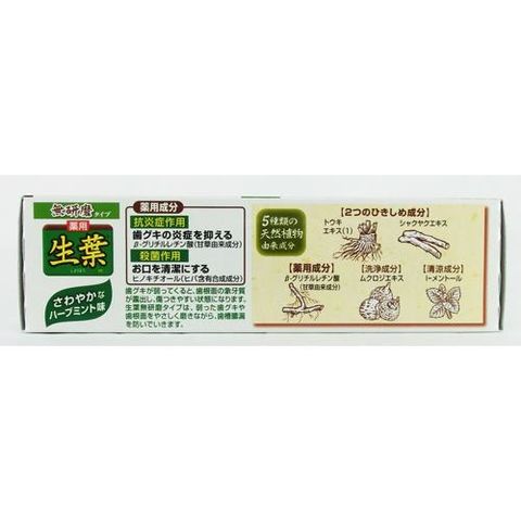 | 湿潤剤:ソルビット液、濃グリセリン 溶剤:水、エタノール 基剤:無水ケイ酸 発泡剤:2-アルキル-N-カルボキシメチル-N-ヒドロキシエチルイミダゾリニウムベタイン、ラウリル硫酸ナトリウム 可溶剤:ポリオキシエチレン硬化ヒマシ油 増粘剤:ヒドロキシエチルセルロース 矯味剤:乳酸アルミニウム 洗浄剤:メタリン酸ナトリウム、ムクロジエキス 香味剤:香料(ハーブミントタイプ) 薬用成分:モノフルオロリン酸ナトリウム(フッ素)、β-グリチルレチン酸、ヒノキチオール 安定剤:エデト酸二ナトリウム、アラントイン 清涼剤:l-メントール 収れん剤:トウキエキス(1)、シャクヤクエキス 防腐剤:パラベン 甘味剤:サッカリンナトリウム 着色剤:黄色4号、青色1号 |