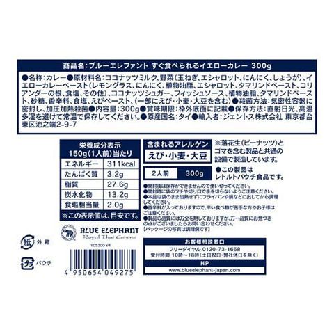 | ココナッツミルク、野菜(玉ねぎ、エシャロット、にんにく、しょうが)、イエローカレーペースト(レモングラス、にんにく、植物油脂、エシャロット、タマリンドペースト、コリアンダーの根、食塩、その他)、 ココナッツシュガー、フィッシュソース、植物油脂、タマリンドペースト、砂糖、香辛料、食塩、えびペースト、(一部にえび・小麦・大豆を含む) |