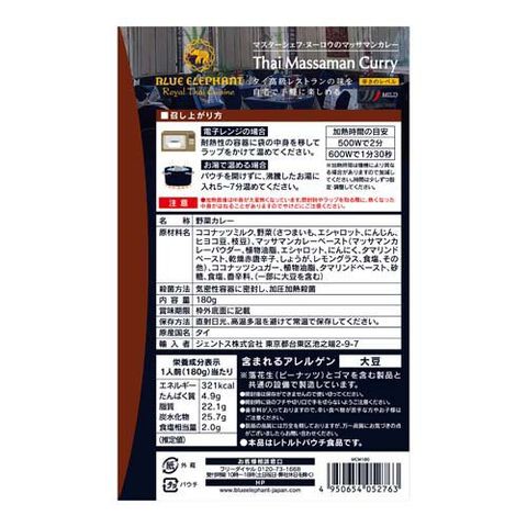 | ココナッツミルク、野菜(さつまいも、エシャロット、にんじん、ヒヨコ豆、枝豆)、マッサマンカレーペースト(マッサマンカレーパウダー、植物油脂、エシャロット、にんにく、タマリンドペースト、乾燥赤唐辛子、しょうが、 レモングラス、食塩、その他)、ココナッツシュガー、植物油脂、タマリンドペースト、砂糖、食塩、香辛料、(一部に大豆を含む) |