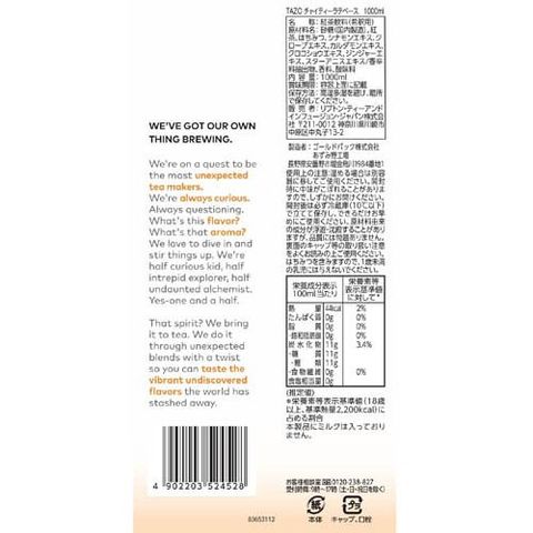 | 砂糖(国内製造)、紅茶、はちみつ、シナモンエキス、クローブエキス、カルダモンエキス、クロコショウエキス、ジンジャーエキス、スターアニスエキス/香辛料抽出物、香料、酸味料 |