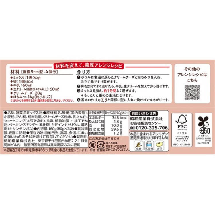 | 砂糖(国内製造)、小麦粉、でん粉、粉末油脂、クリームチーズ粉末、乳たん白、ショートニング(大豆を含む)、食塩、植物油脂/加工でん粉、ベーキングパウダー、乳化剤、カゼインナトリウム、増粘剤(キサンタンガム) |