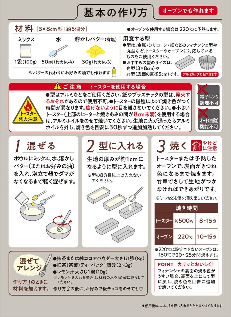 ●材料を混ぜて、トースターで焼くだけで簡単に作れるフィナンシェミックスです。