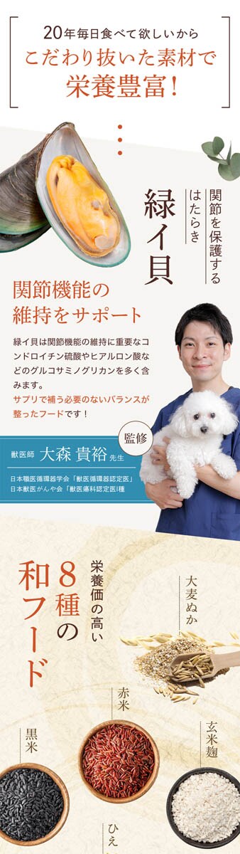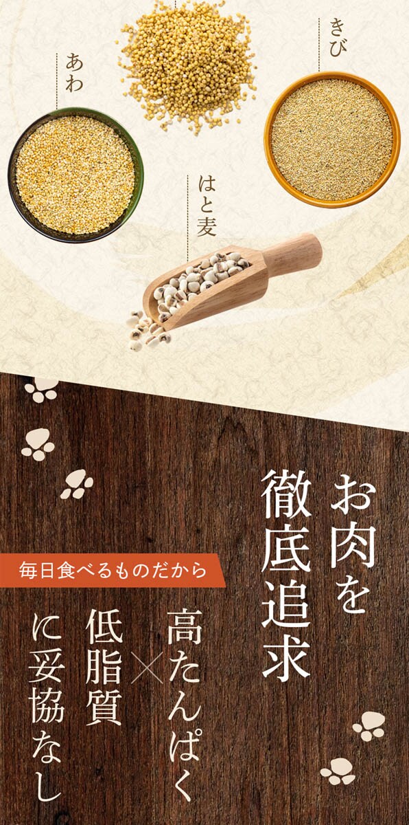 | 肉類(鶏肉、馬肉、鶏レバー)、大麦、玄米、鰹節、大麦ぬか、ビール酵母、米油、卵黄粉末、マグロ、黒米、赤米、イヌリン(水溶性食物繊維)、コラーゲンペプチド、発酵調味液、玄米麹、 はと麦、あわ、きび、ひえ、フラクトオリゴ糖、昆布、大根葉、ごぼう、人参、緑イ貝、乳酸菌、DHA含有精製魚油粉末、セレン酵母、キャベツ、ブロッコリー、かぼちゃ、むらさきいも、 さつまいも、あかもく、わかめ、白菜、高菜、パセリ、青じそ、タウリン、L-トレオニン、ミネラル類(リン酸三カルシウム、塩化ナトリウム、塩化カリウム、グルコン酸亜鉛、ピロリン酸第二鉄、グルコン酸銅)、 ビタミン類(ビタミンA、ビタミンD、ビタミンE、ビタミンB2、ビタミンB12、パントテン酸カルシウム) |