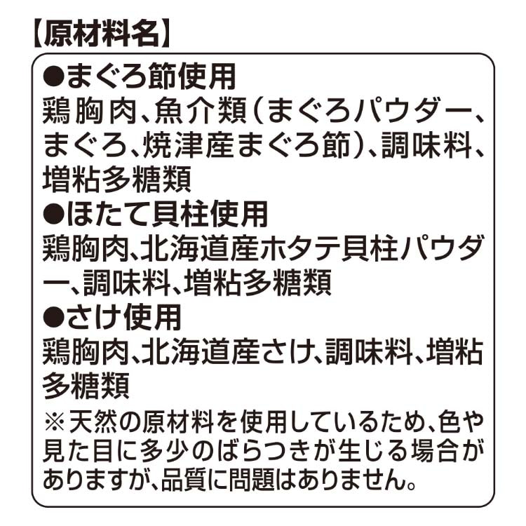 | ・まぐろ節使用:鶏胸肉、魚介類(まぐろパウダー、まぐろ、焼津産まぐろ節)、調味料、増粘多糖類 ・ほたて貝柱使用:鶏胸肉、北海道産ホタテ貝柱パウダー、調味料、増粘多糖類 ・さけ使用:鶏胸肉、北海道産さけ、調味料、増粘多糖類※天然の原材料を使用しているため、色や見た目に多少のばらつきが生じる場合がありますが、品質に問題はありません。 |