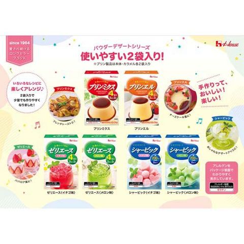| 「プリンエル」 ゼラチン 「プリンミクス」 乳成分・ゼラチン 「ゼリエースイチゴ味」 ゼラチン 「ゼリエースメロン味」 ゼラチン 「シャービックイチゴ味」 乳成分 「シャービックメロン味」 乳成分 |