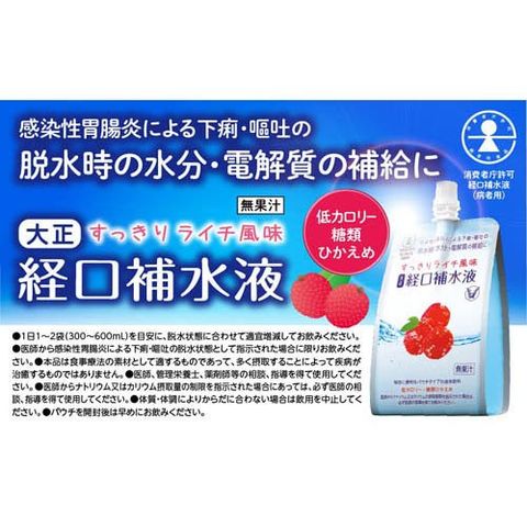 ●大正 経口補水液は、すっきりライチ風味の保存に便利なパウチタイプの液体飲料です。